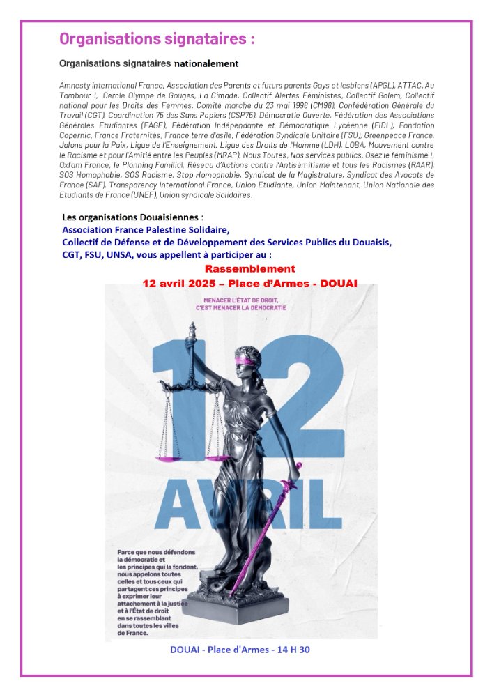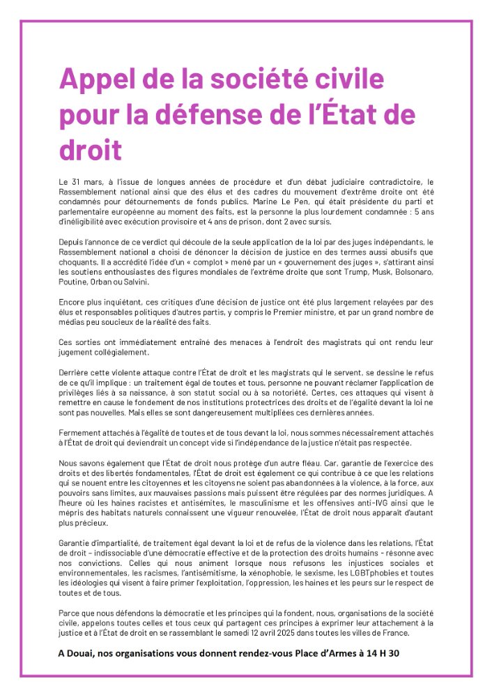 Appel de la société civile pour la défense de l’État de droit – 12 avril 2025 Rassemblement - 12 avril 14 H 30 Place d’Armes Douai